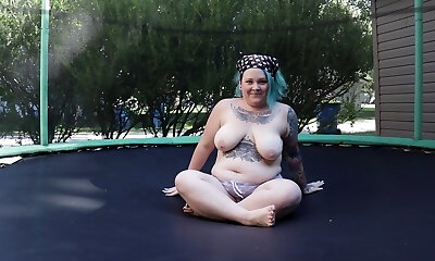 Fat Inked Milf Jumping and Stripping on a Trampoline