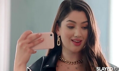 Cute girl Milla takes a selfie and pets her own pink soddening pussy