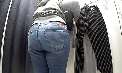 In a fitting room in a public store, the camera caught a chubby milf with a gorgeous butt in semi-transparent panties. PAWG.