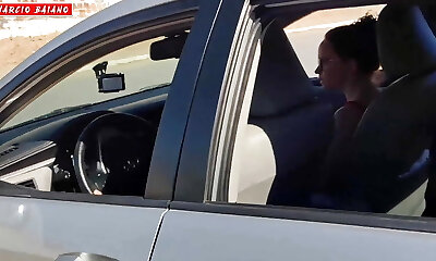 Aroused girlfriend stops her beau's car to blow him with force