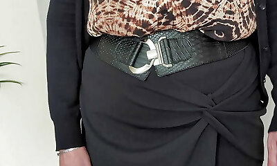Going to work in a blouse, skirt ,stockings and heels. Ready for my younger boss to inspect my mature funbags, ass and bald cunt.