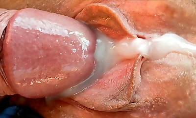 Slim Milf in pantyhose. Labia fuck close-up. Big load of cum on pussy!