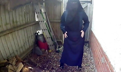 Niqab Mega-slut! Fette Moslemnutte strippt im Hinterhof!