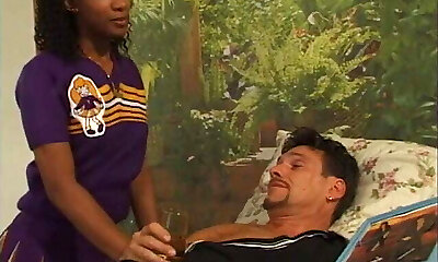 Insatiable ebony cheerleader fucks drinker on bed